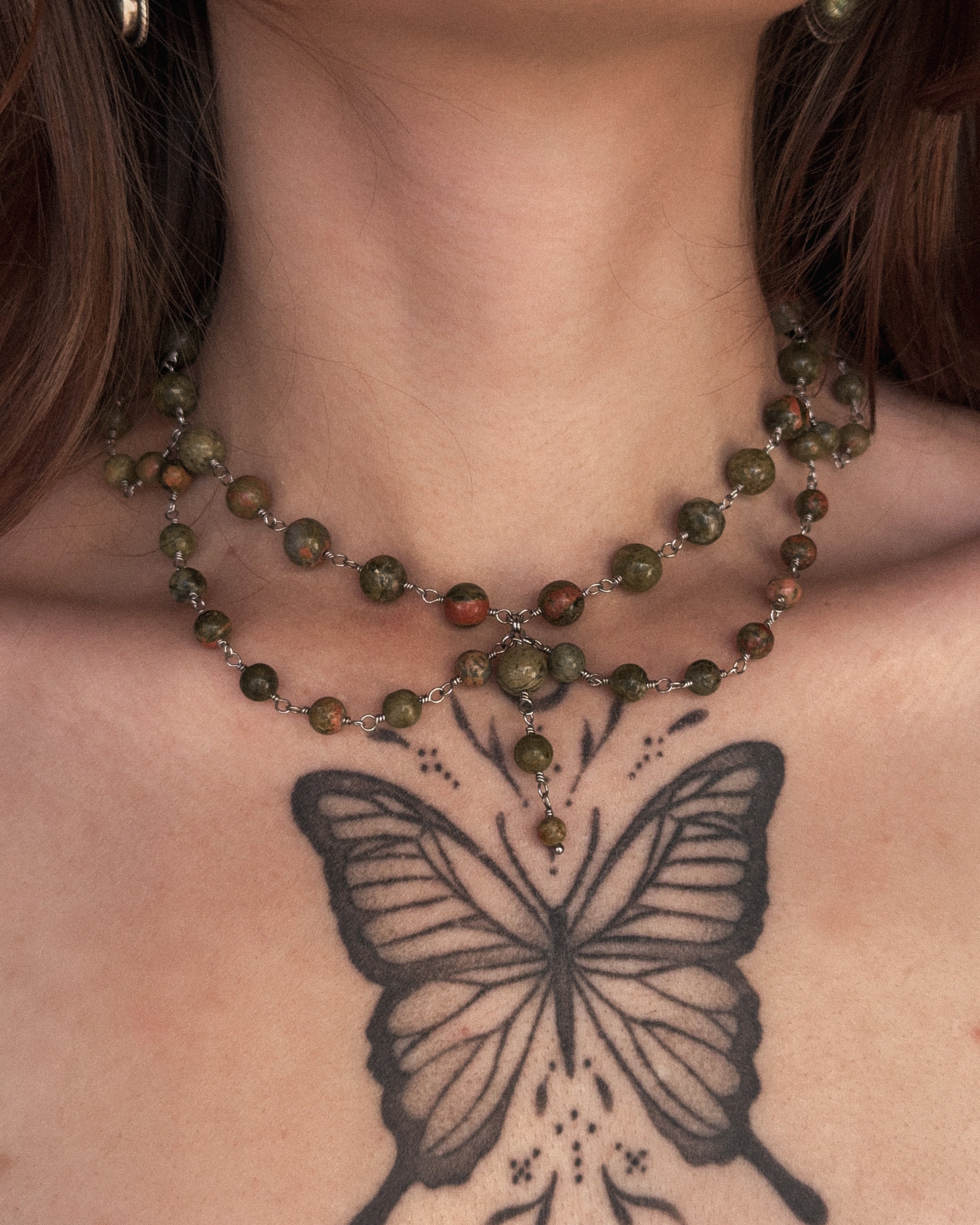 Aerin est un collier réalisé à la main. Il se compose de perles en pierre naturelle, montées sur des fils métalliques assorties en acier inoxydable (pour la version argentée) et en laiton anti-ternissement (pour la version dorée). Comme toutes les créations Crystalia, il est ajustable grâce à une chaîne d’extension.