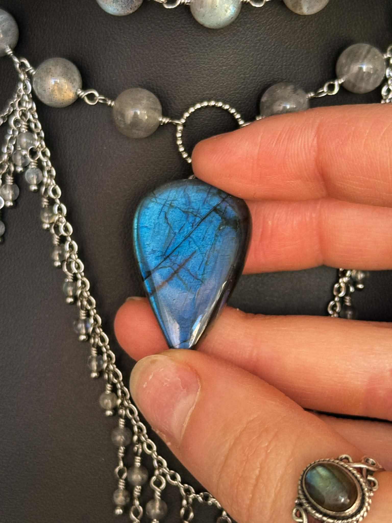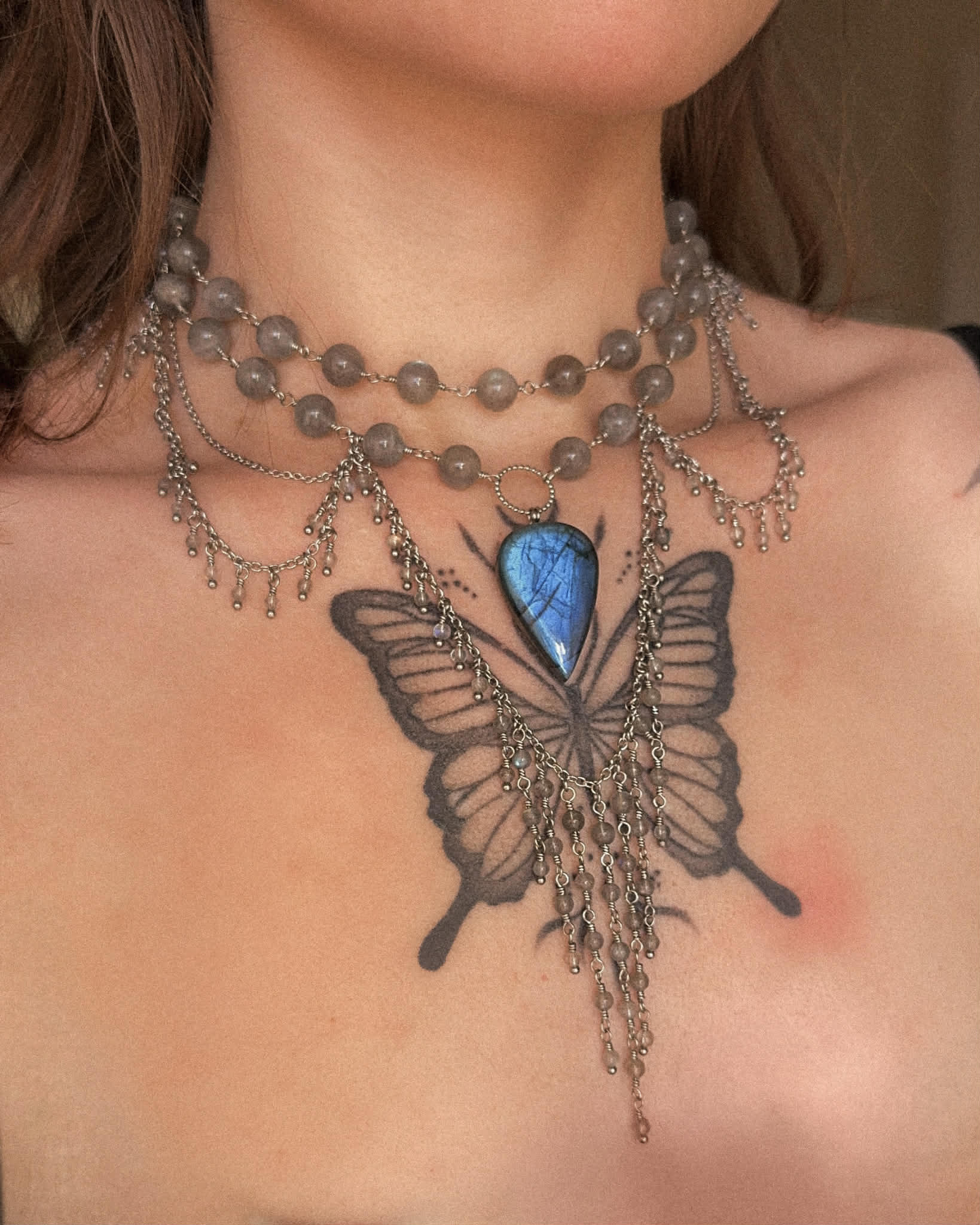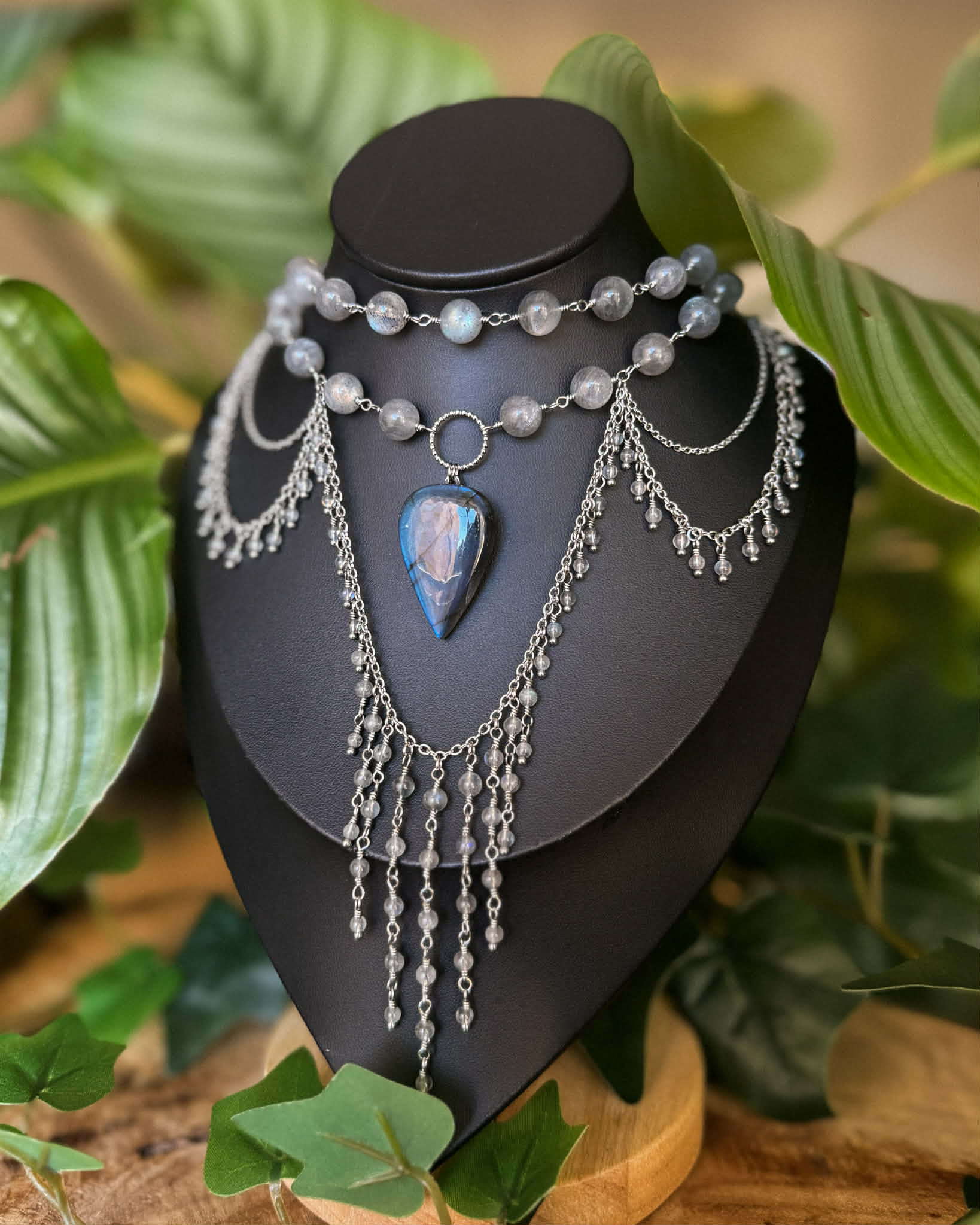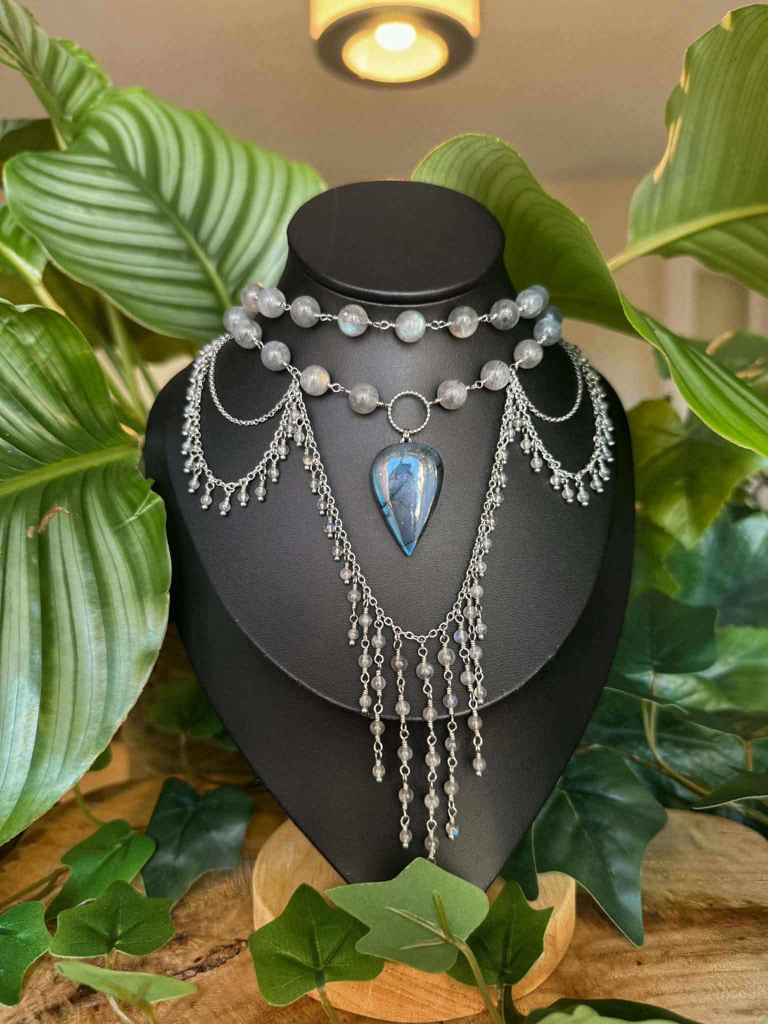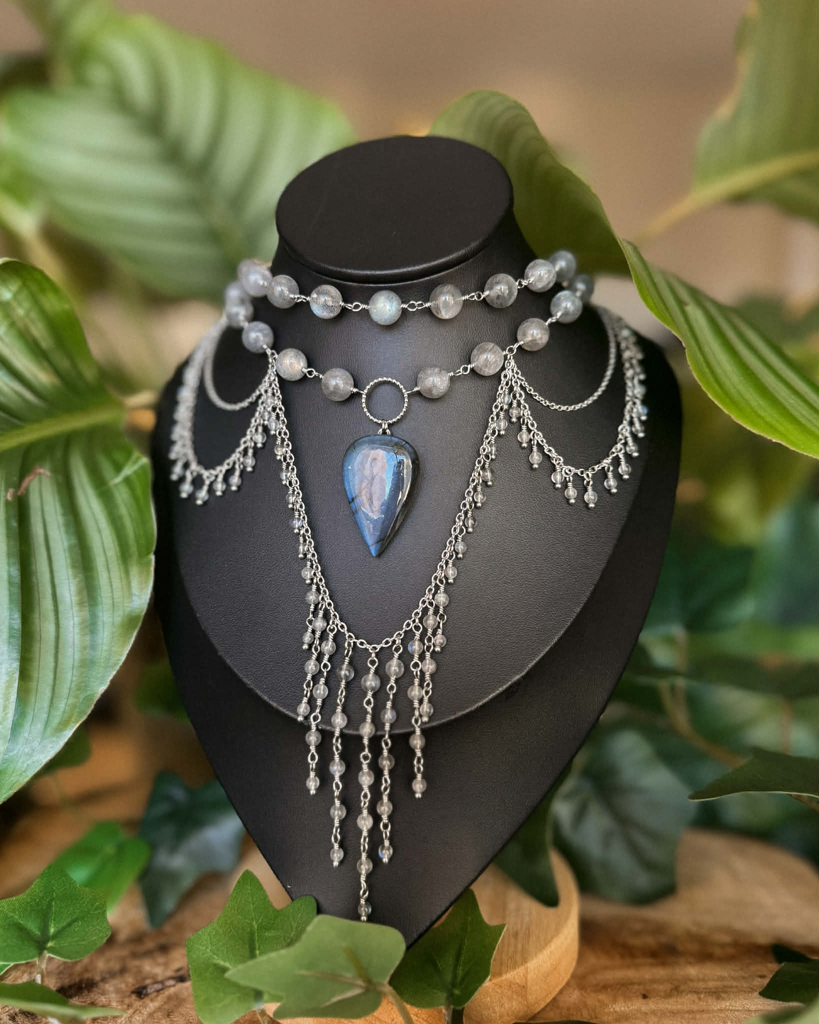 Luanya est un collier entièrement réalisé à la main, composé de perles de labradorite naturelles. Monté sur acier inoxydable, il m’a demandé plus de 6h30 de travail. Comme toutes les créations Crystalia, il est ajustable grâce à une chaîne d’extension.