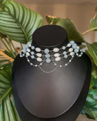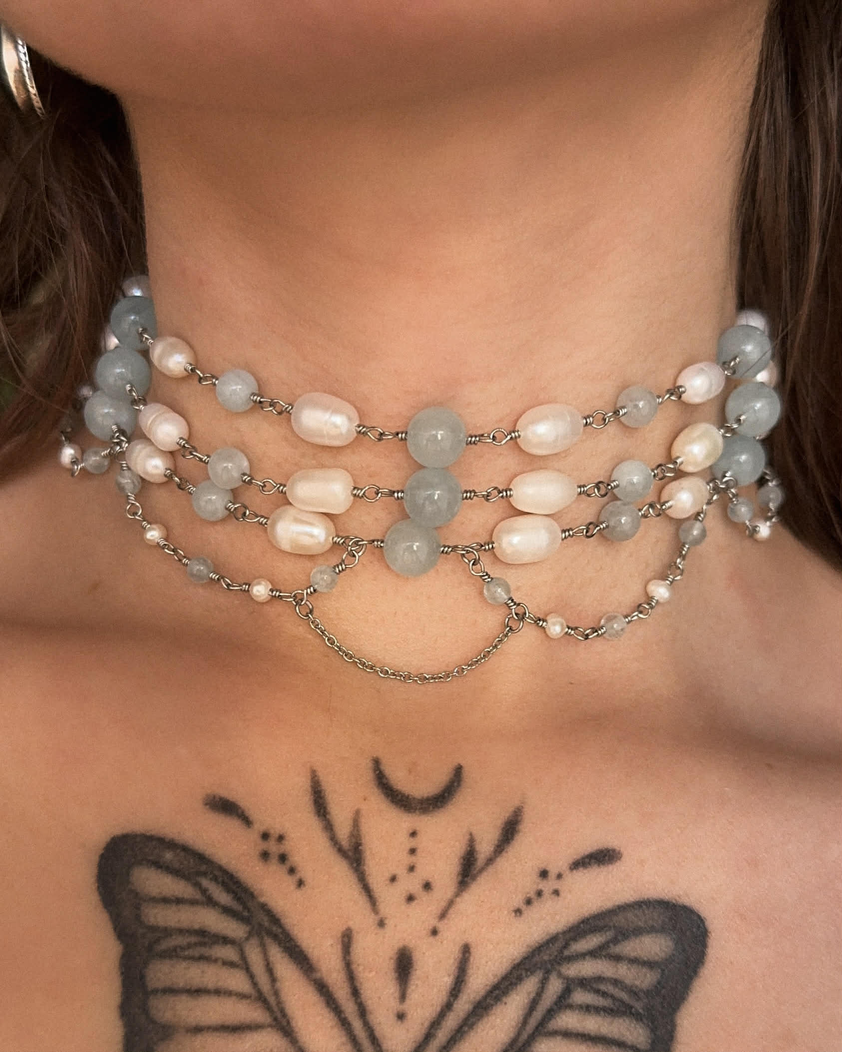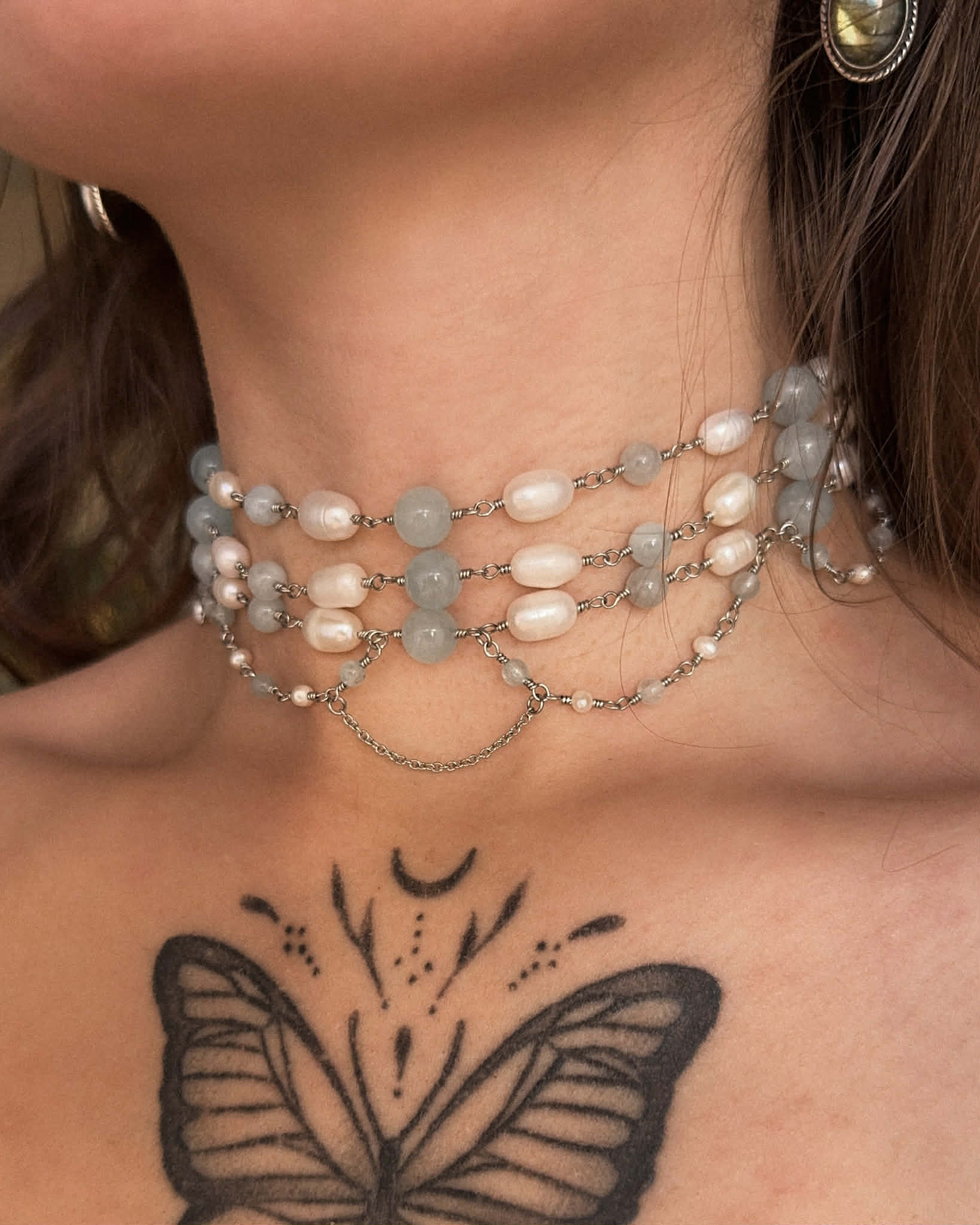 Ondine est un collier entièrement réalisé à la main, composé de perles d'aigue marine naturelles et de perles d'eau douce véritables. Monté sur acier inoxydable, il m’a demandé plus de 5h30 de travail. Comme toutes les créations Crystalia, il est ajustable grâce à une chaîne d’extension.