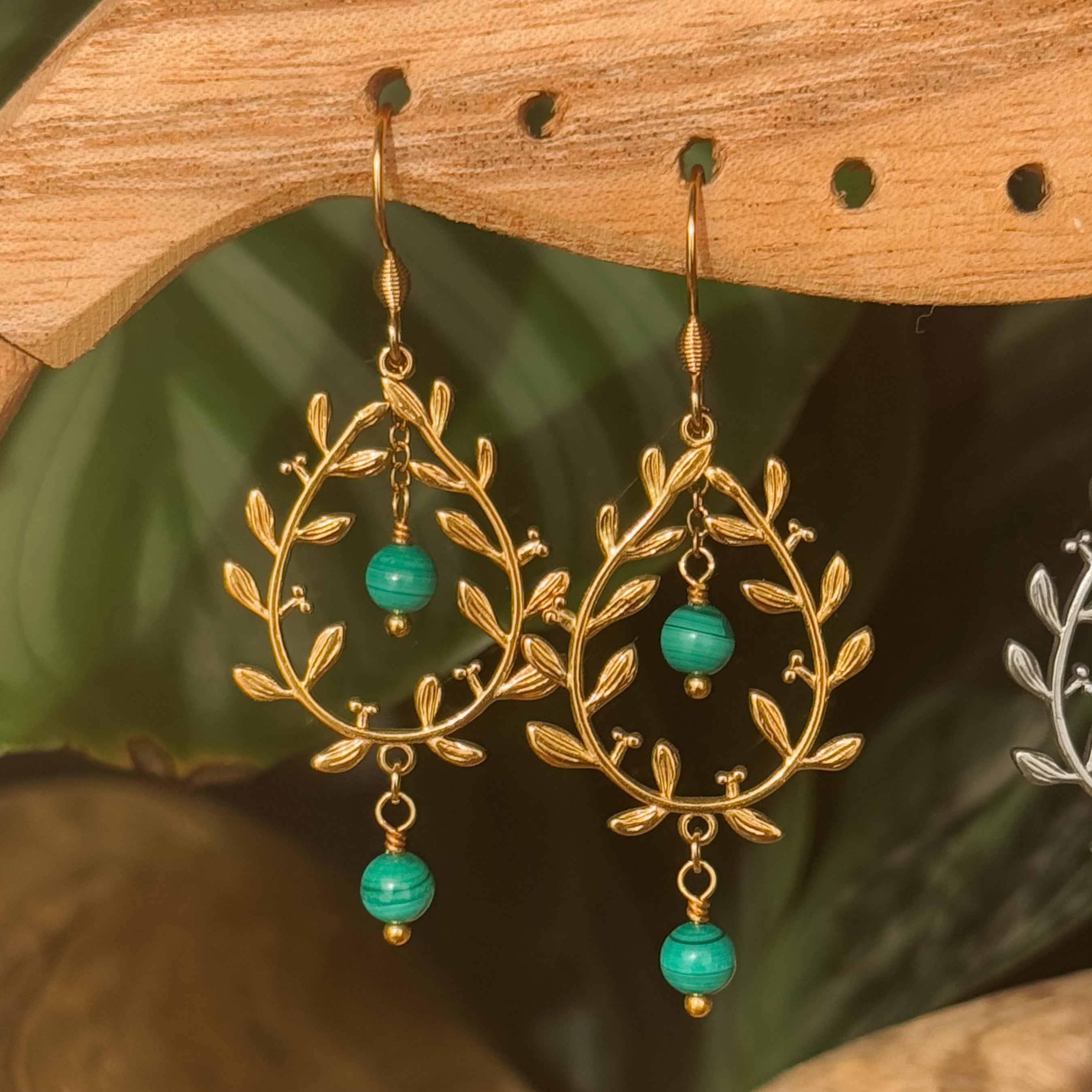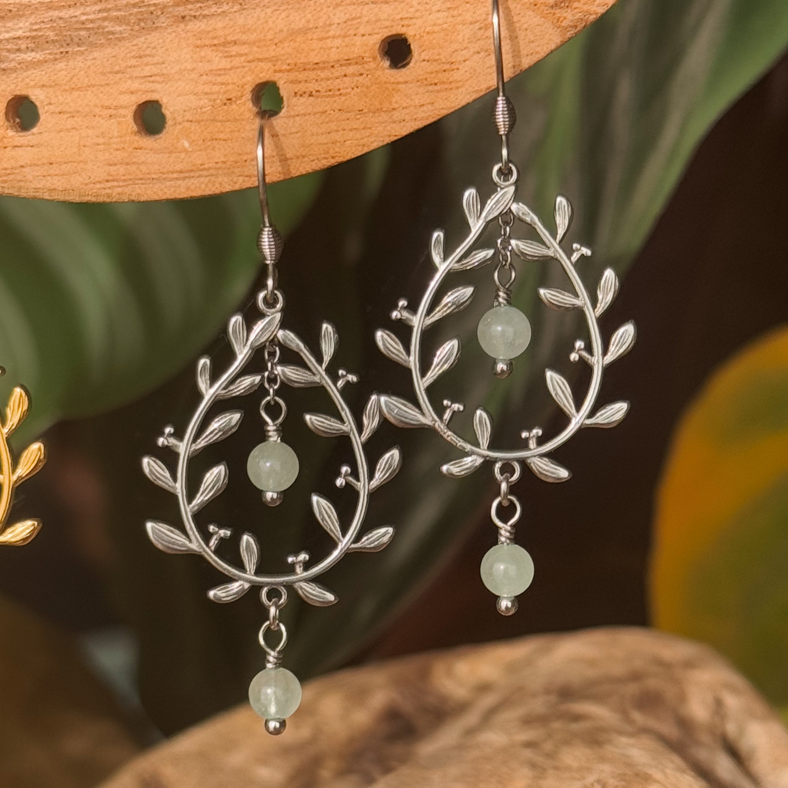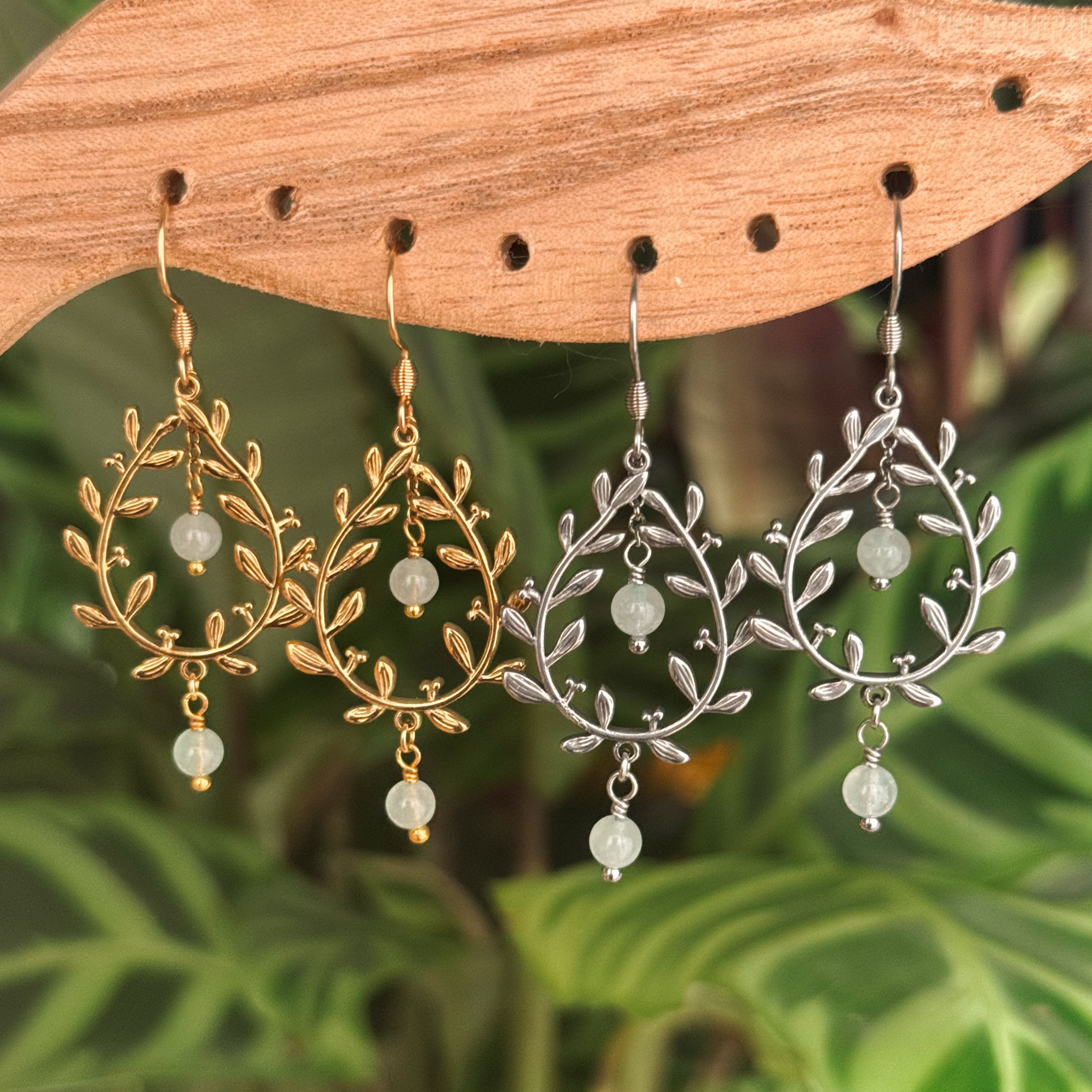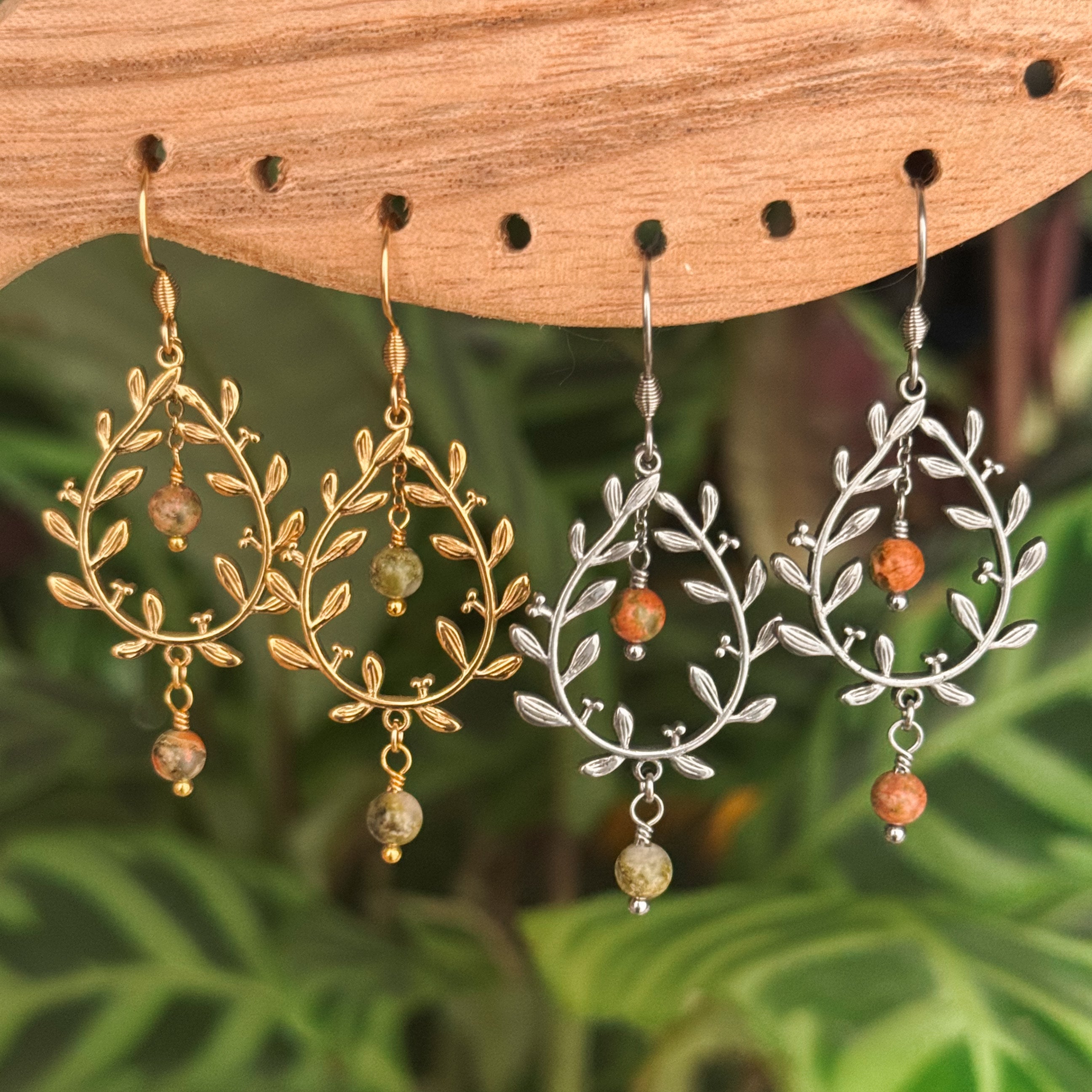 Ilyssëa est une paire de boucles d’oreilles réalisée à la main, composée de perles en pierre naturelle et de breloques en acier inoxydables, montées sur des crochets en acier inoxydable.