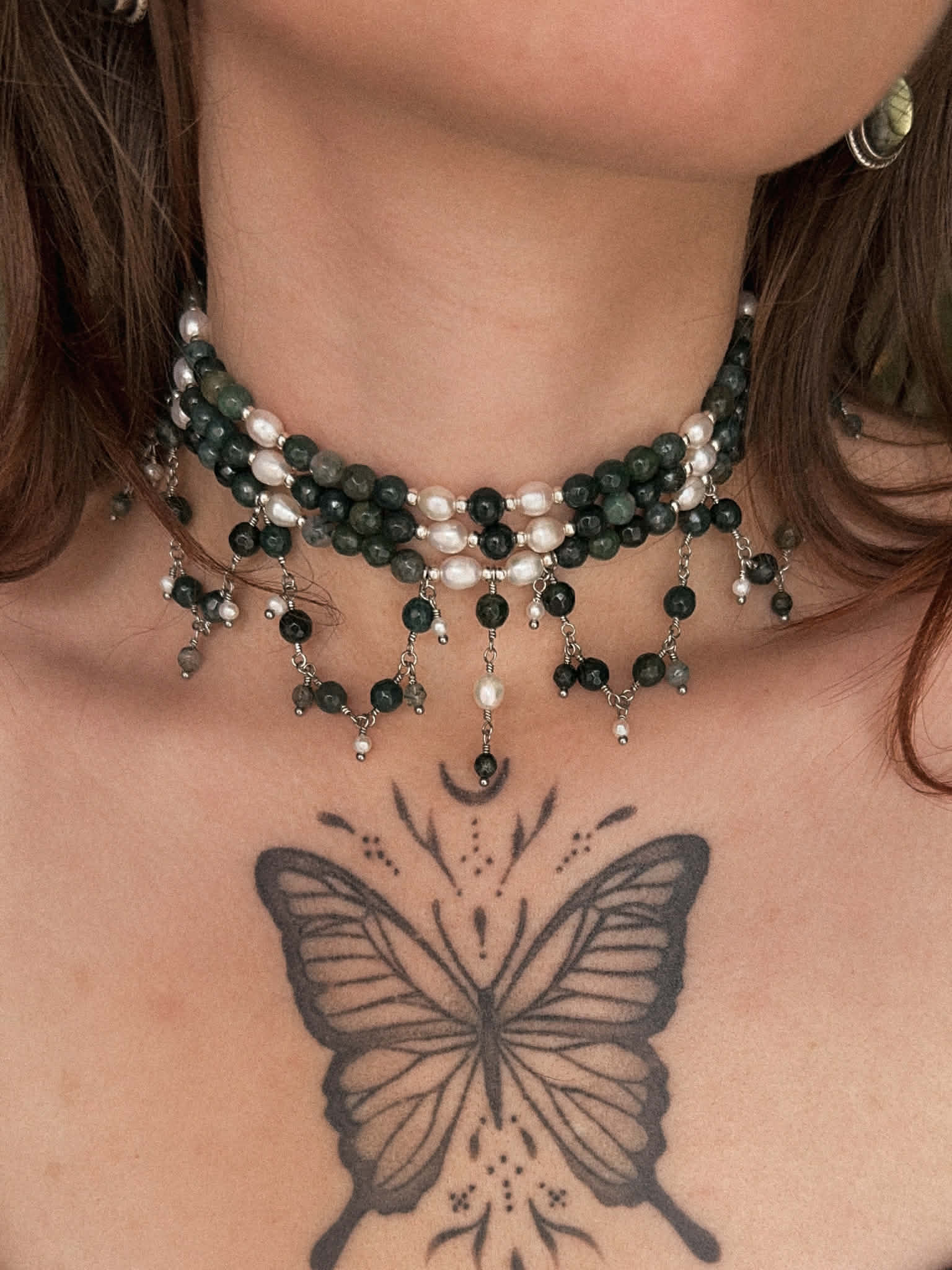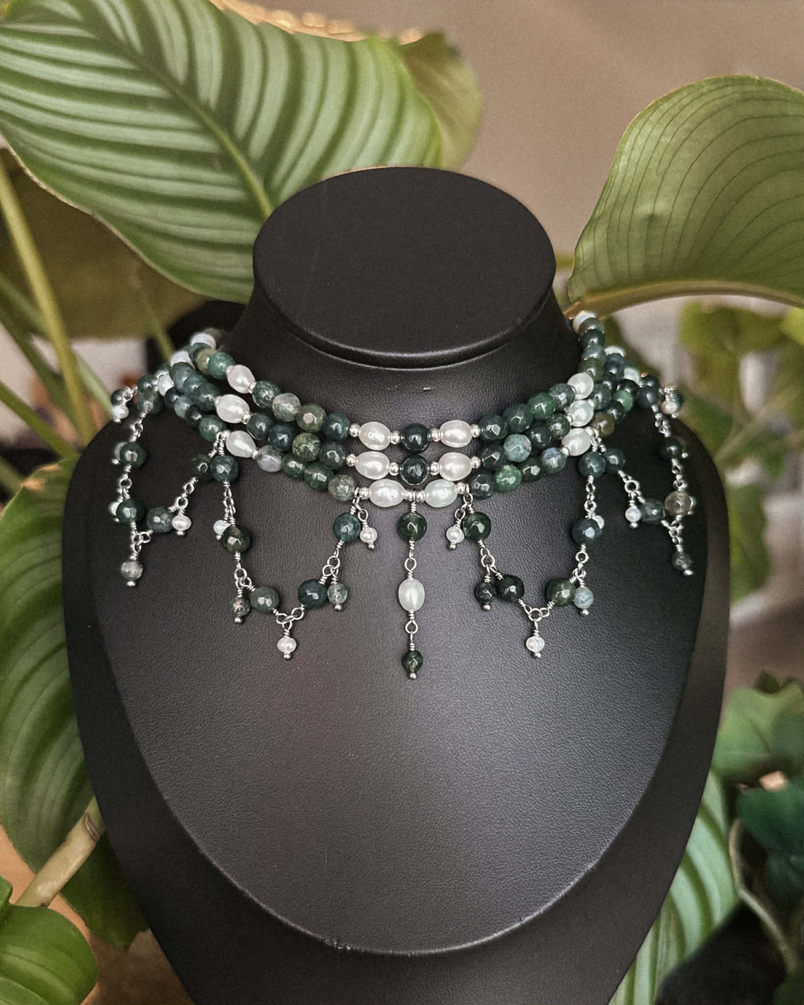 Alvara est un collier entièrement réalisé à la main, composé de perles d’agate mousse naturelles et de perles d'eau douce véritables. Monté sur acier inoxydable, il m’a demandé plus de 5h30 de travail. Comme toutes les créations Crystalia, il est ajustable grâce à une chaîne d’extension.