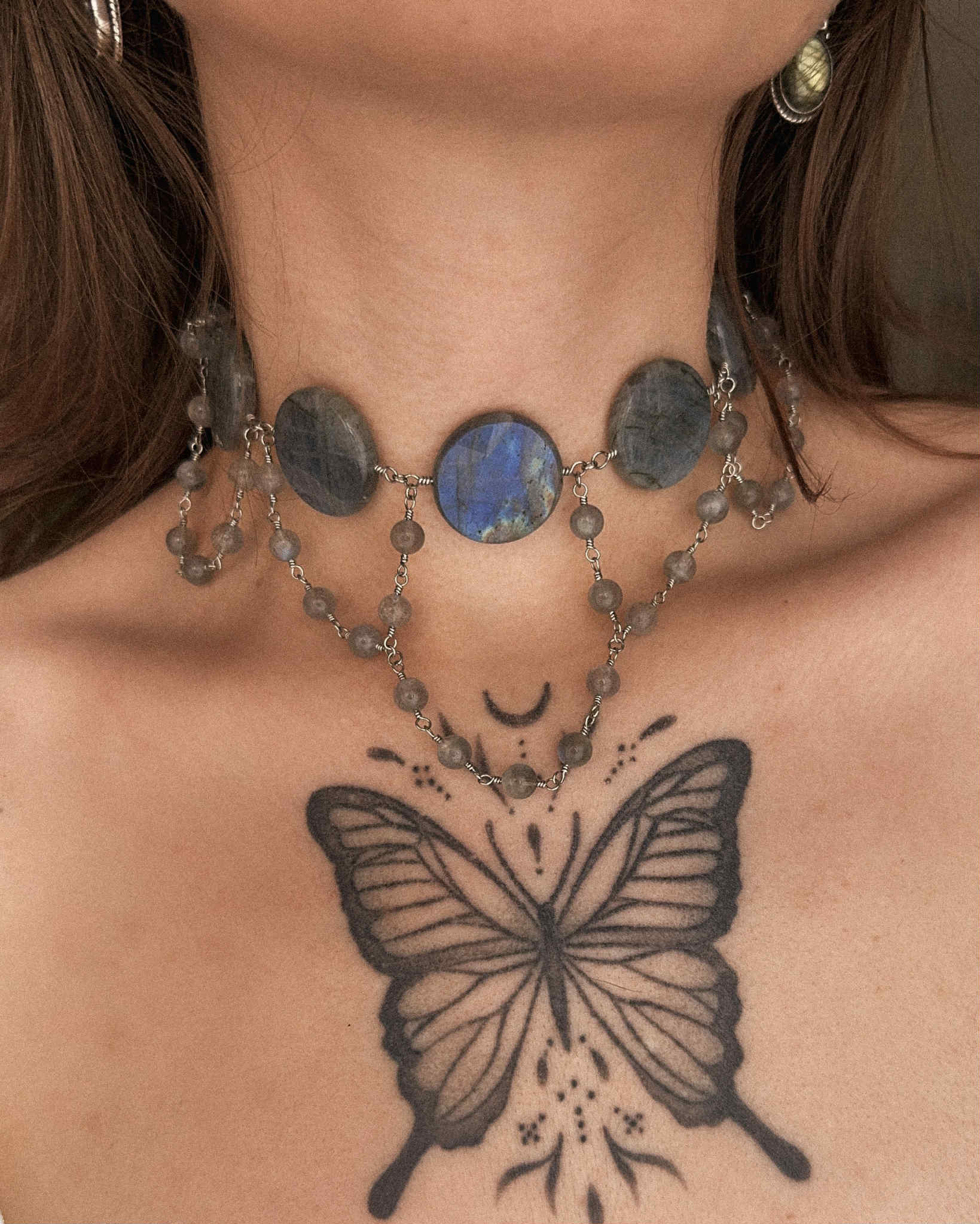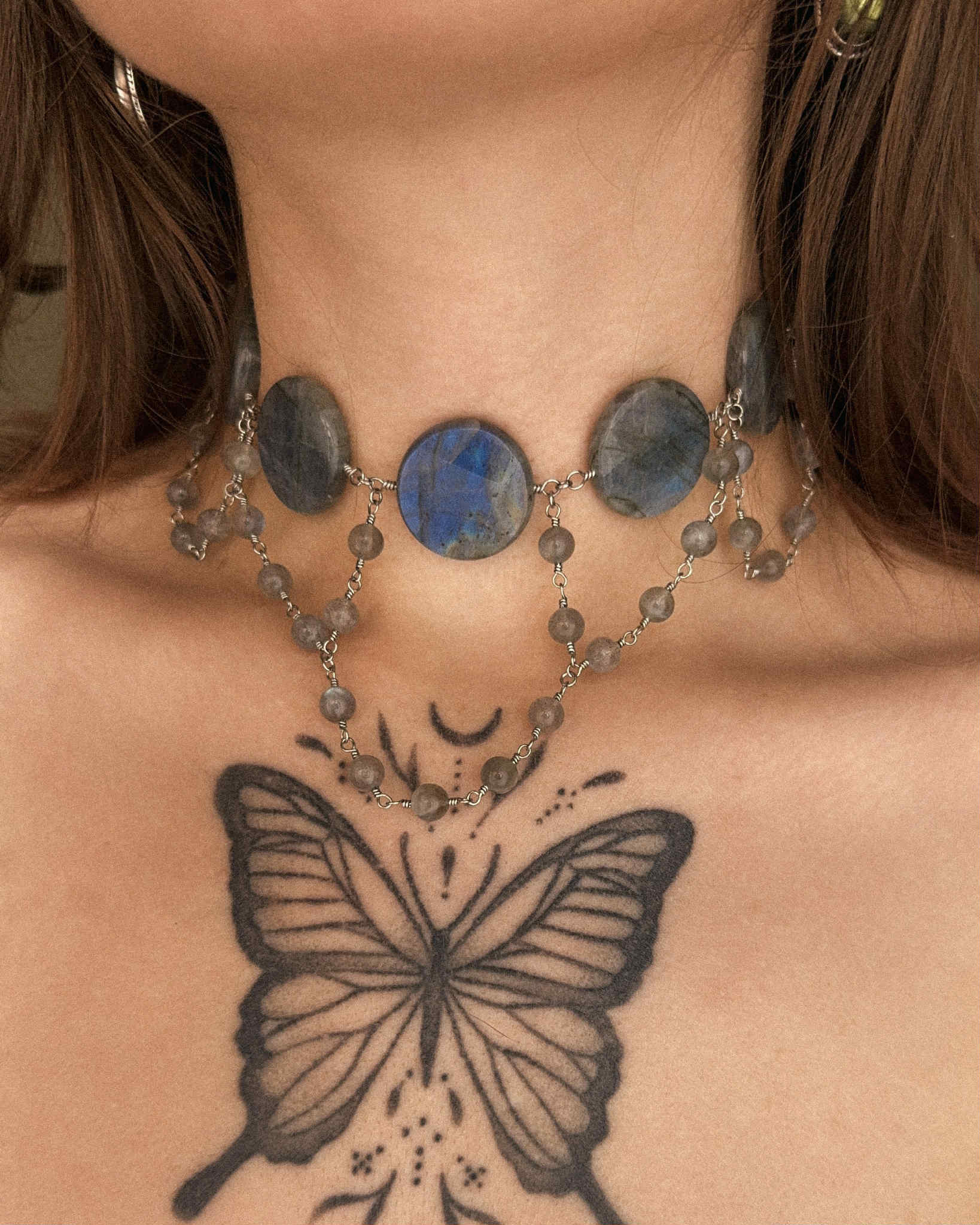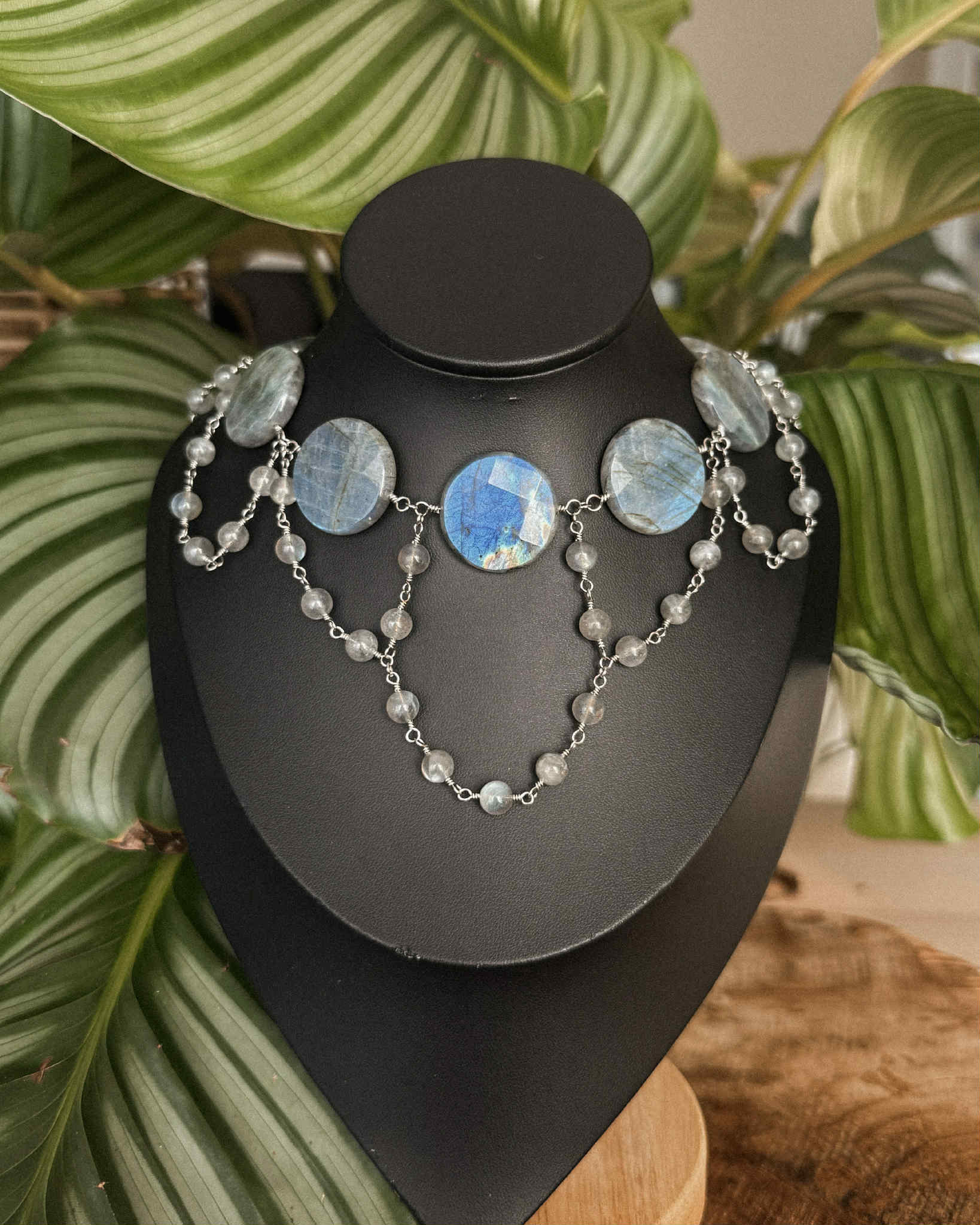 Laurelin est un collier réalisé à la main, composé de perles de labradorite naturelles, montées sur acier inoxydable. Comme toutes les créations Crystalia, il est ajustable grâce à une chaîne d’extension.