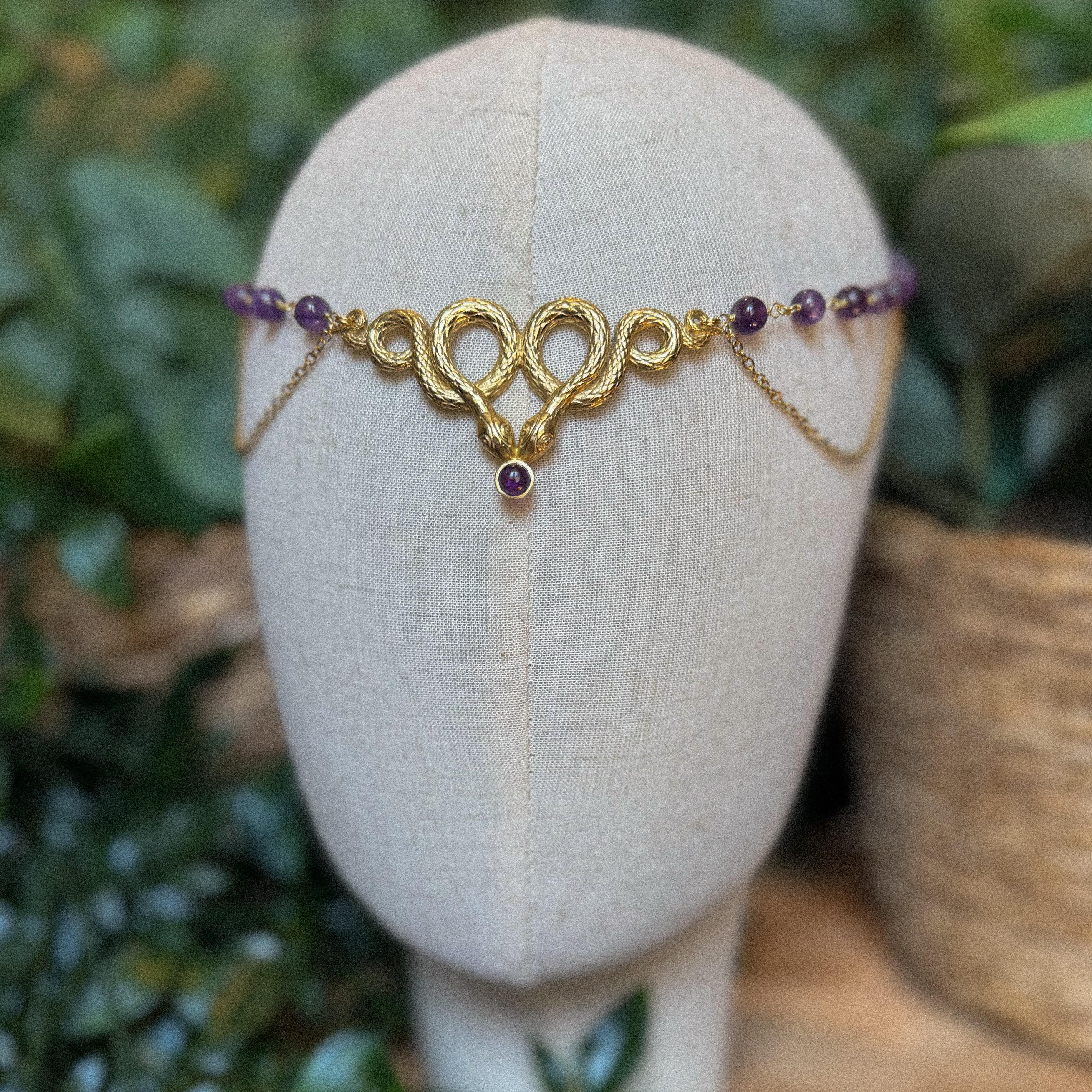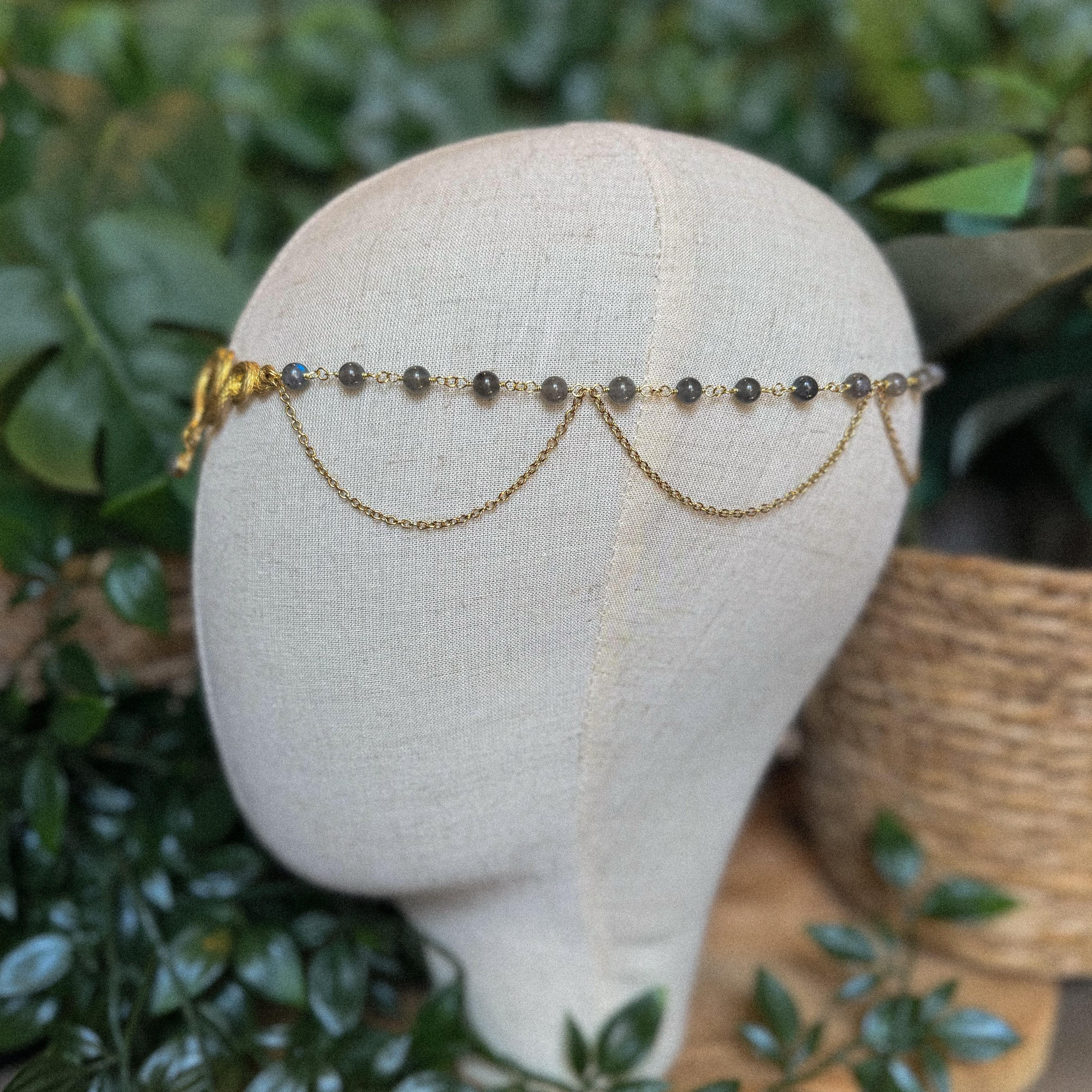 Ancalagon est un bijou de tête réalisé à la main. Il se compose de perles en pierre naturelle et d'un connecteur en laiton et pierre naturelle. Comme toutes les créations Crystalia, il est ajustable grâce à une chaîne d’extension.